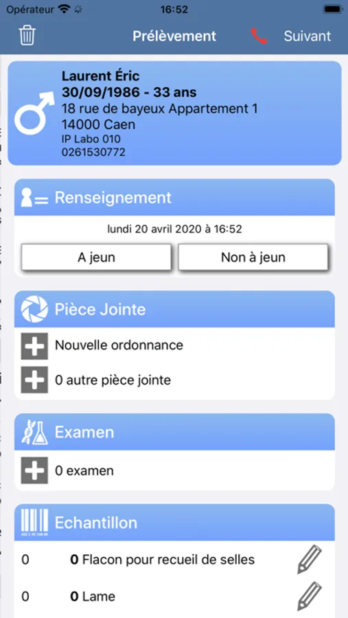 Le guide de prélèvement (pour chaque analyse) est accessible dans le smartphone et mis à jour en temps réel avec le laboratoire.