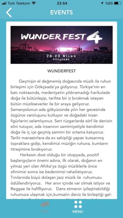 Kurulduğu günden beri Radyo Modyan'ın zevkle, samimiyetle, azimle sunduğu Wunderfest, bir yaz sezonunda daha mükemmel bir hafta sonu için Gökçeada'ya davet ediyor. İlk seferki pastoralliğinden ödün vermeyen Wunderfest güneşle derinizi, rüzgarla saçlarınızı, denizle genzinizi ve doğayla ruhunuzu bir araya getiriyor.