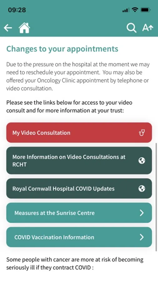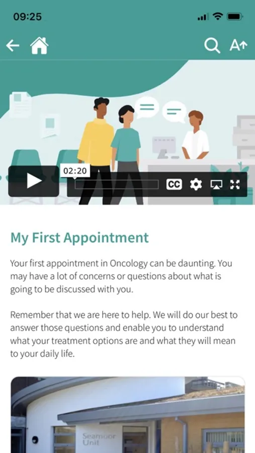 It provides a complete up-to-date information and reference tool, which guides and supports patients through their cancer treatment pathway. It helps patients contact their team more effectively and at the right time supporting acute oncology helplines, virtual pre-assessment, pre-habilitation, holistic needs, follow up after treatment and even points patients through to video consults. It is complete with a whole range of information videos, relevant links, cancer resources, support groups and contact information all specific to your own NHS Hospital cancer centre.