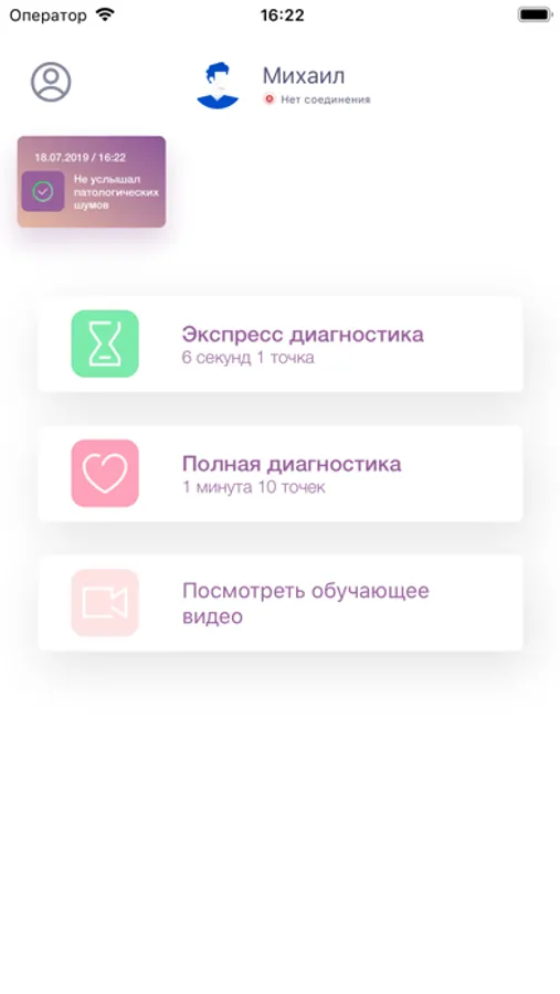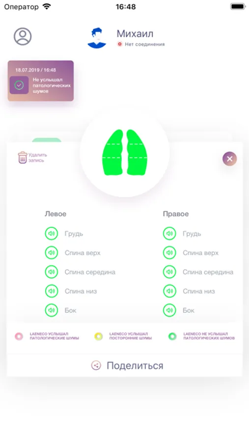 По инструкции в приложении вам необходимо приложить стетоскоп к телу и дождаться сигнала о завершении прослушивания. Цикл измерений занимает от 30 сек до 5 мин в зависимости от выбранного режима.