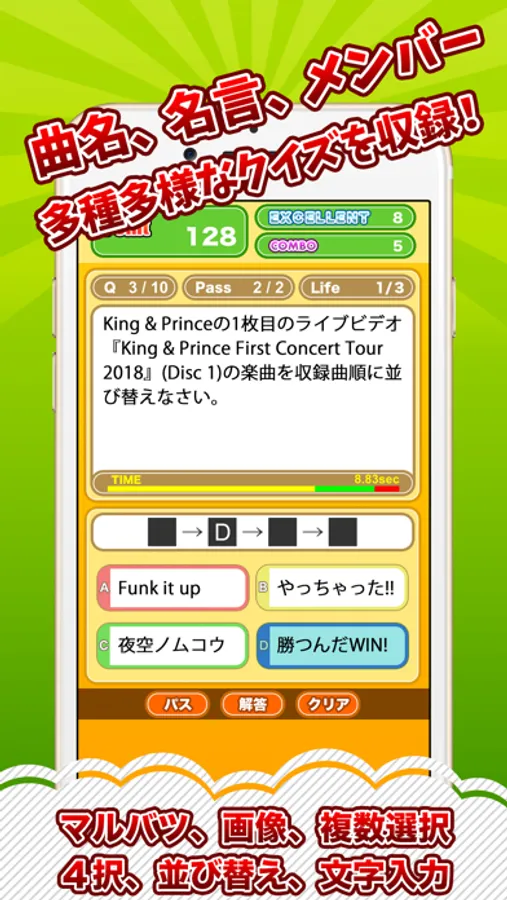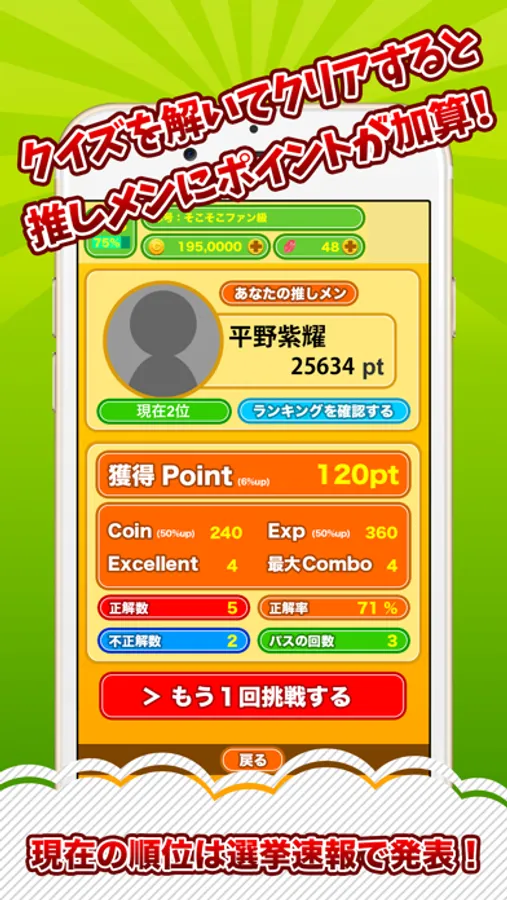 クイズを10問解くと推しメンにポイントが加算されます。(全問正解でポイント2倍!)