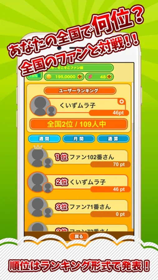 あなたは全国何位?クイズで獲得したポイントはユーザーランキングに反映されます。全国のファンとクイズ対決!