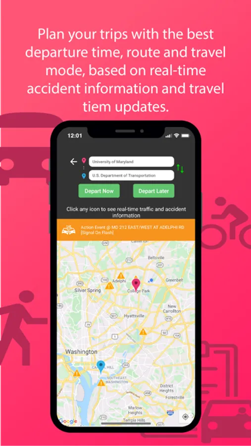 incenTrip employs the latest real-time data and machine learning technologies to accurately predict traffic to help travelers avoid both day-to-day congestion and traffic jams caused by traffic accidents, transit maintenance, work zones, special events, and adverse weather conditions. App users can find all multimodal travel options including transit, rideshare, driving, walking, biking, and multimodal options.