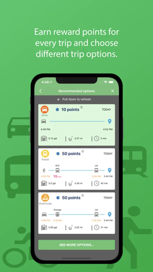 App users earn reward points while receiving recommendations on the best travel mode, departure time and/or route before and during a trip. User can exchange their reward points for gift cards or cash.