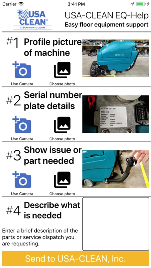 EQ-Help from USA-CLEAN is a simple but powerful tool to diagnose and address problems you are having with your floor cleaning equipment quickly and effortlessly. Simply take a photo of the machine, the serial number, and the part needed…then press “send”. The USA-CLEAN team will receive your message and get you the part or dispatch a technician so you’ll be back up and running in no time!