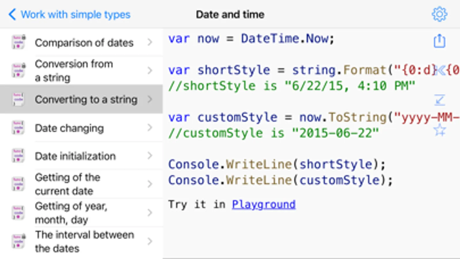 • All examples in the application are available offline. The application can be used when the Internet connection is not available.