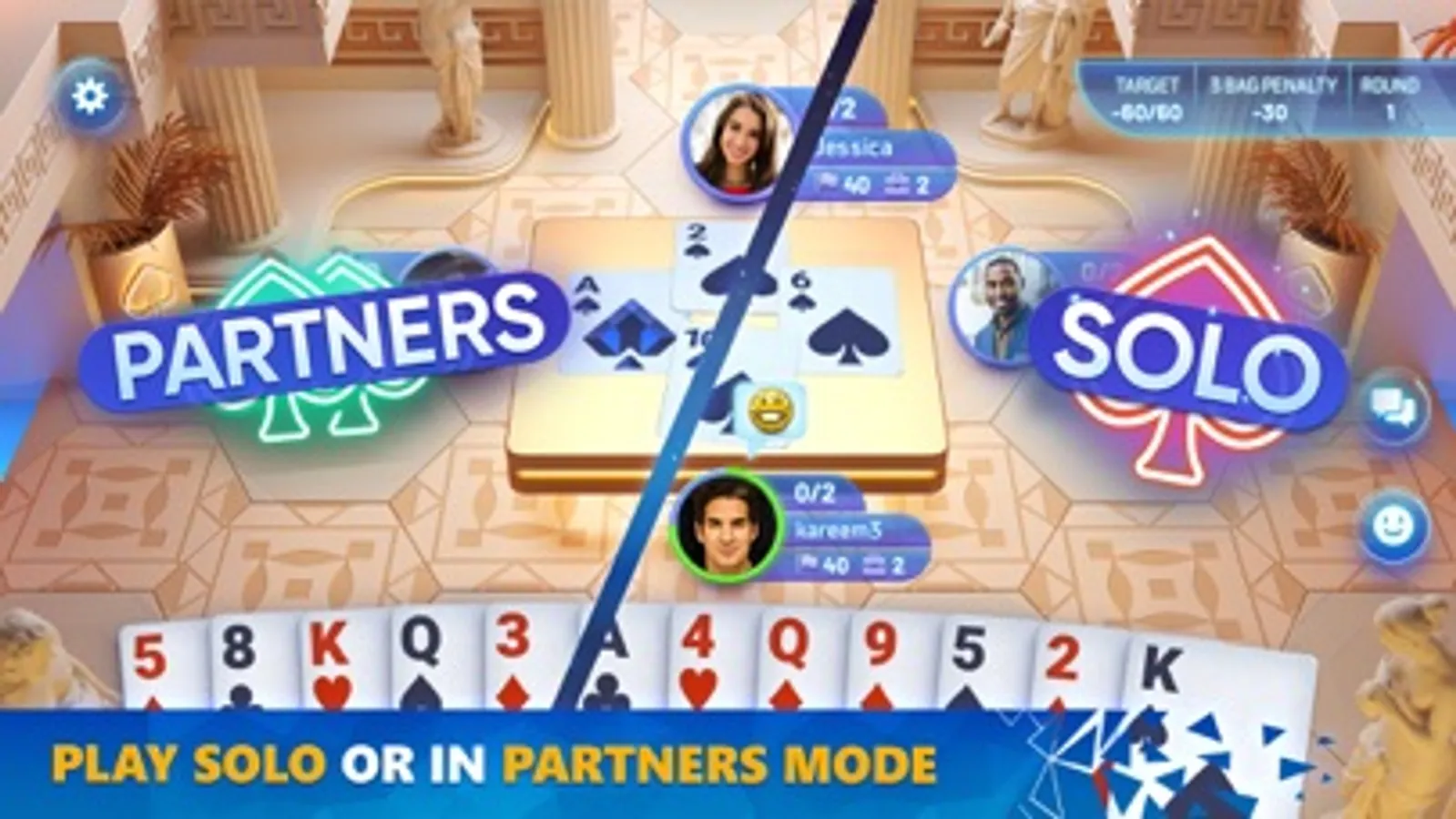 Spades Masters brings you the latest in graphics technology and ironed out mechanics to ensure you enjoy a well balanced and streamlined gaming experience right at your fingertips. . You can play in Solo or Team (Partners) modes each with special events and daily benefits to maximize your winnings.