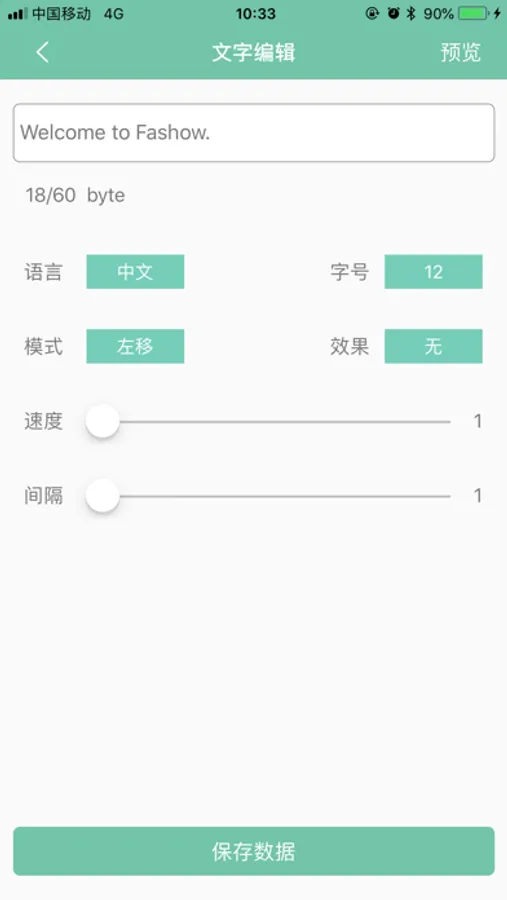 Fashow 一款基于蓝牙4.0技术开发的手机APP,可以编辑添加自定义信息,支持文字,动画,音乐互动,手写绘图等特色功能,变换方式多种多样,支持左移,右移,上滚,下滚,雪花等多种模式,支持文字移动速度设置。