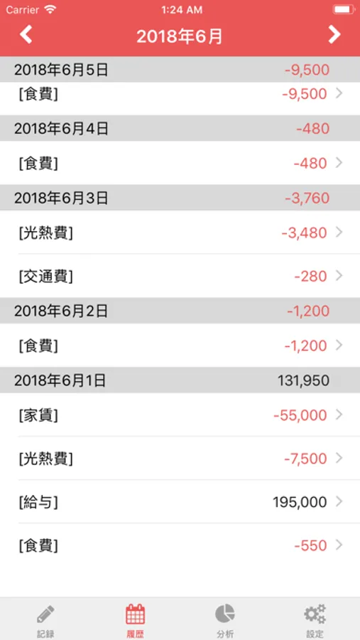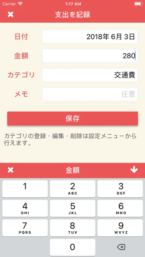 使い方はホーム画面で収入か支出のボタンを選択して、手順にそって入力するだけ。