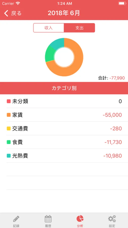 項目ごとに細かく管理したい人には、カテゴリ機能で項目ごとの収支管理が可能。