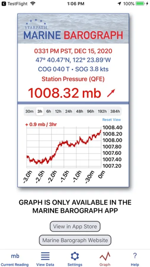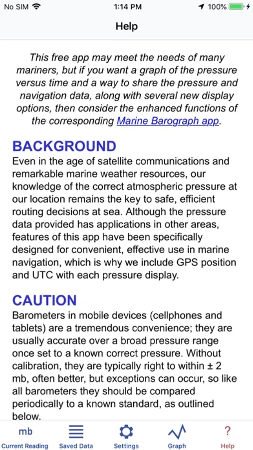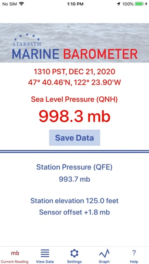 Marine Barometer is a barometer sensor interface that is uniquely designed to meet the needs of mariners who rely on accurate atmospheric pressure for weather routing and the evaluation of weather maps. Pressure readings can be manually saved permanently along with the latitude, longitude, and time of the reading. If a sensor offset has been applied, that value is also stored with each recorded pressure. These recorded pressures can then at the navigator's convenience be transferred to the vessel's printed logbook.