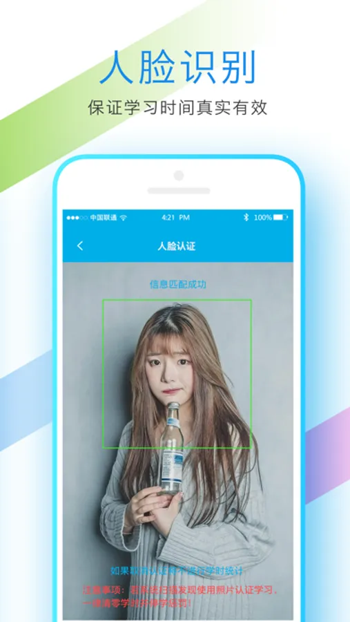 应用内置人脸识别功能,可保证学习真实性的基础上,让学员通过手机终端远程计时学习与线下集中学习达到等同效果。