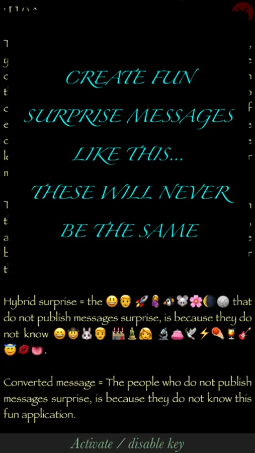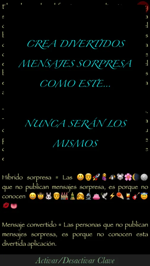 The way in which you can discover the content of the message surprise sent to you, the ones you send, the ones you see published or that you post on the wall of a social network, is using this same application. ¡Attention - Watch out! All surprise messages must be generated using this application.