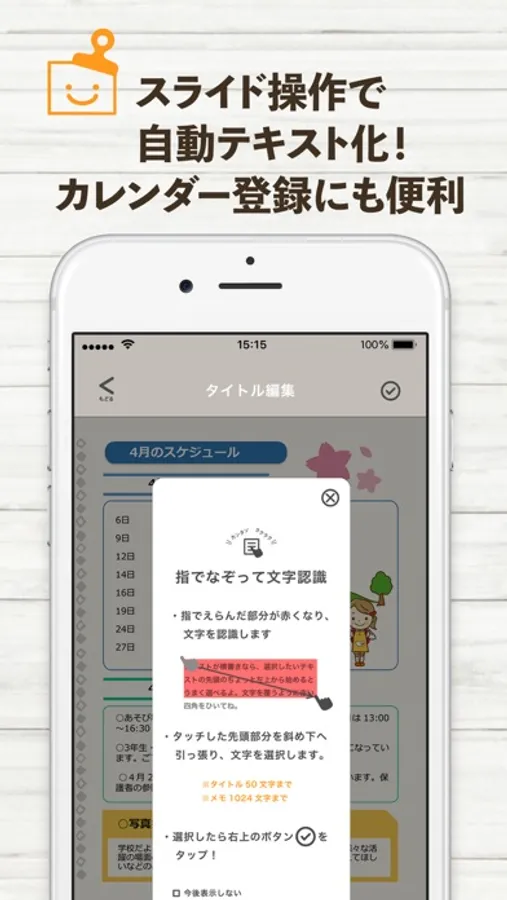 ・「おたより」写真の文字をなぞると文字を自動読み取りします。