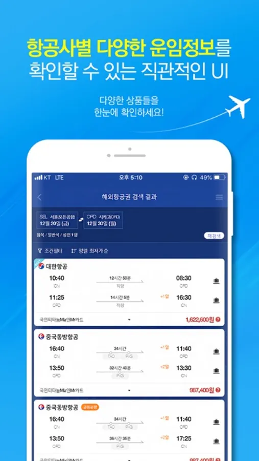 5. 항공사, 직항/경유, 좌석상태, 항공금액 범위 설정 등 다양한 필터기능 제공