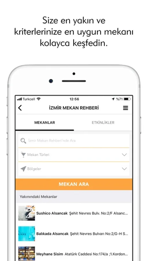 İzmir’de aradığınız hangi mekan olursa olsun bir tıkla ulaşabileceğiniz, önceden bilgi sahibi olabileceğiniz ve rahat bir seçim yapmanızı sağlayacak, bu şehir için yapılan en keyifli, en eğlenceli mekan platformunu oluşturduk.