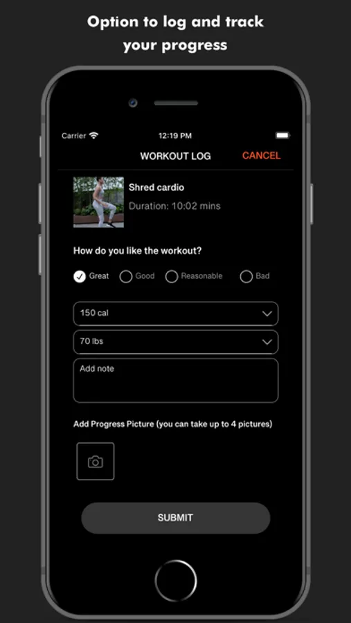 • Track your workouts and see your progress over time with our workout log feature.