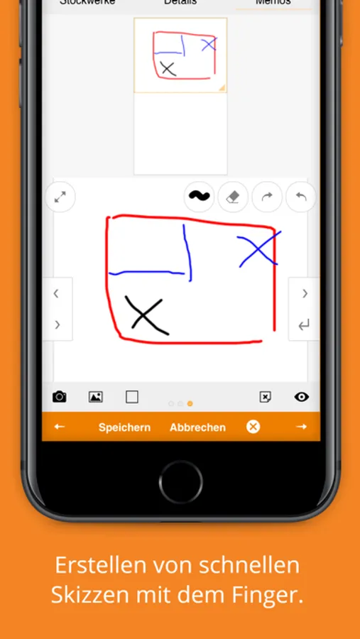 Mit Hilfe von Memos haben Sie die Möglichkeit, zu Projekten, Stockwerken oder Räumen zusätzliche Informationen in Form von Notizen oder mit Ihrem Geräte aufgenommenen Bildern oder Sprachmemos zu erfassen. Darüber hinaus können Sie mit dem Finger kleine Skizzen anfertigen oder Markierungen auf aufgenommenen Bilder vornehmen.