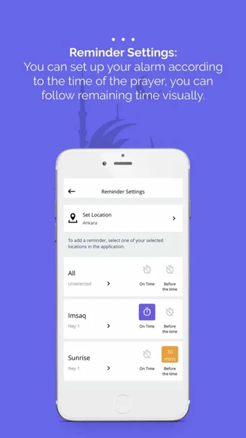 Reminder Settings: You can set up your alarm according to the time of the prayer, you can follow remaining time visually.