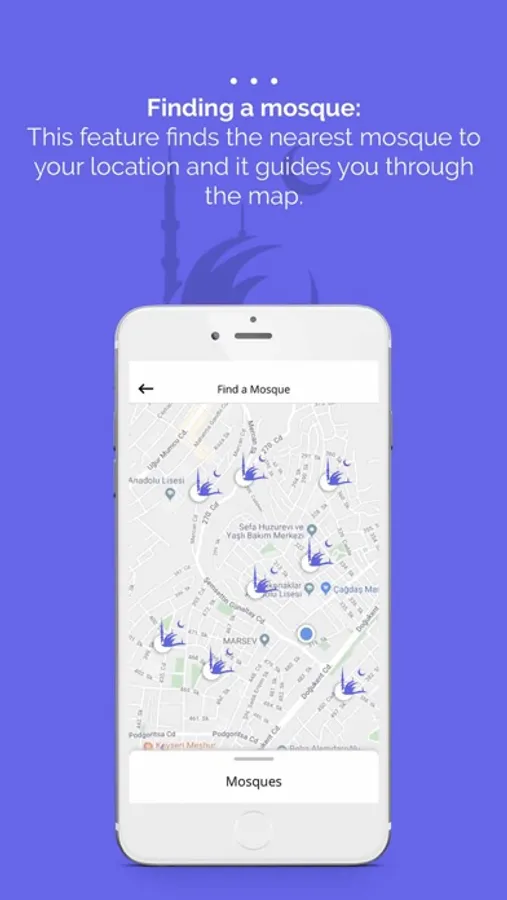 Finding a mosque: This feature finds the nearest mosque to your location and it guides you through the map.