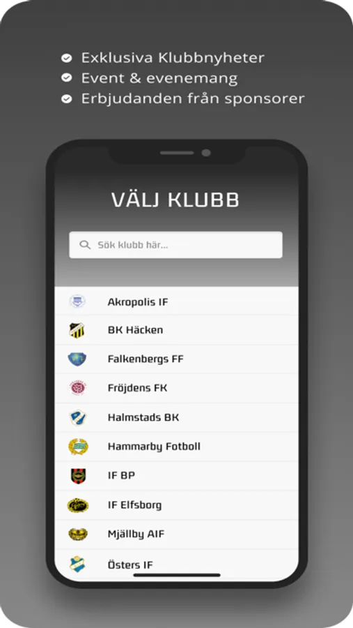 Alla lag har sin egna sida. Via onboarding-processen kommer du kunna välja sport, sen lag och sen om du är supporter eller partner.