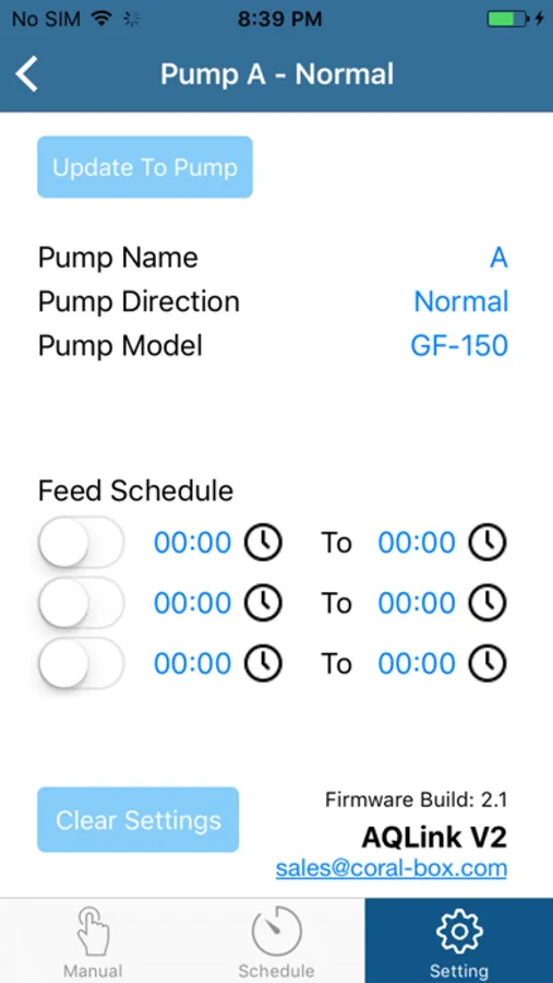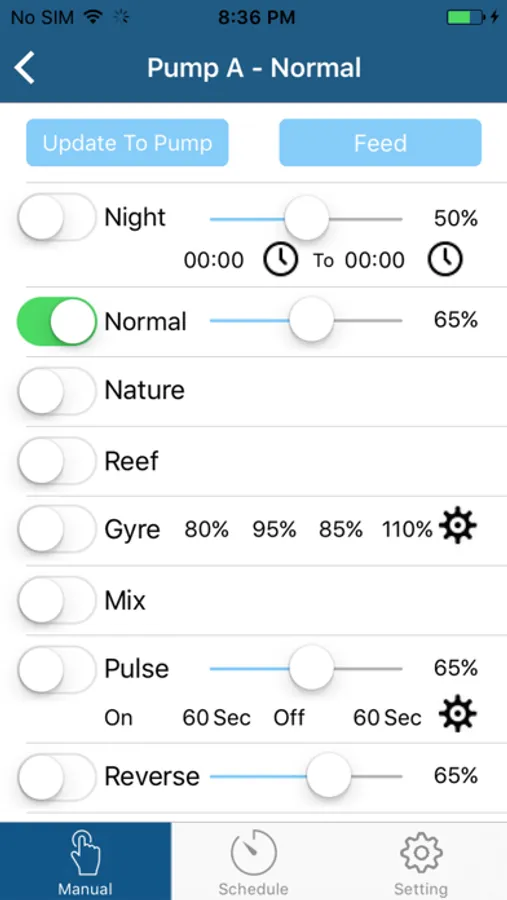 This App can wirelessly connect upto 4 AQLink compatible aquarium wave maker and pumps via WiFi at the same time, allow users to manually control and schedule different operations modes. Besides NORMAL direct control mode, there are modes: Nature, Reef, Gyre and Mix mode by scheduling with these operation modes, this certainly can help maintaining your tank of lovely fishes enjoying all day long.