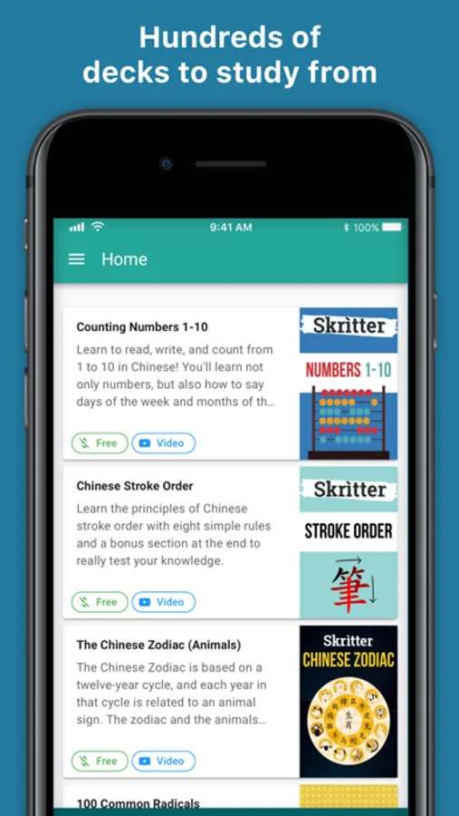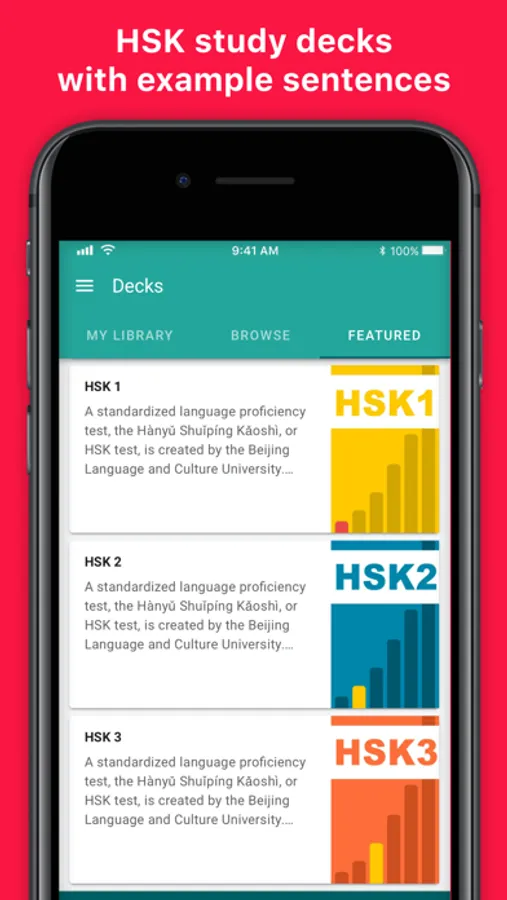 If you have seen Chinese writing before, you probably noticed that it requires us to learn characters rather than the roman alphabet we know from English. You can learn it through our “decks” (similar to a card deck) based on topics and difficulty.