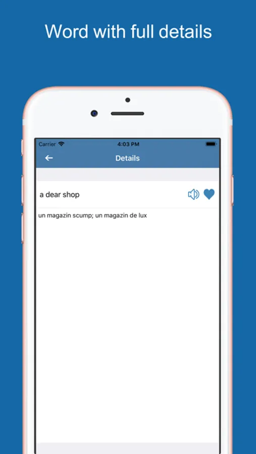 - Want to save a word meaning in the favourites? Tap the heart button and we will add this word automatically in your favourites. You can easily access to it anytime within the favourites choice in the options menu.