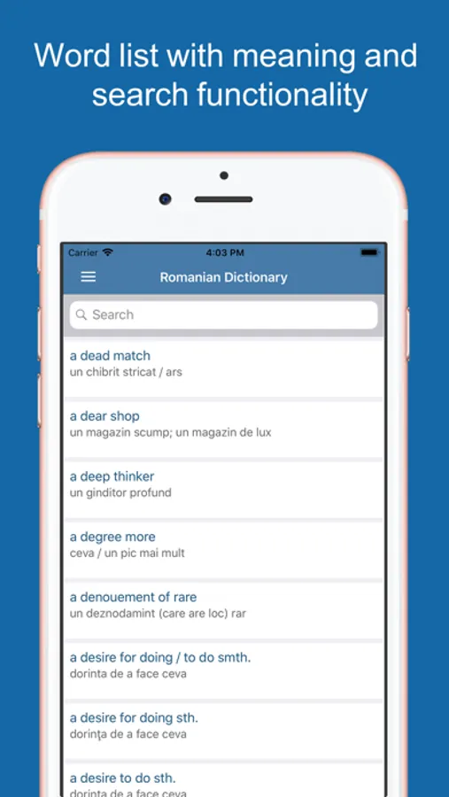 - We have a very Easy Interface to use, so everyone can use it simply without watching any tutorial. We worked hard to make everything easier to you. In the main screen, you will be able to see all words. There, you can type the english word that you are looking for and we will take care of finding the meanings of this word in Romanian language.
