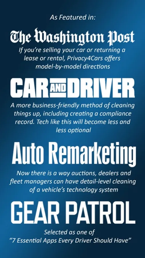 GEAR PATROL “Saves you time (and frantic Googling) by providing simple, step-by-step instructions for deleting your personally-identifiable information from any car.” - 7 ESSENTIAL APPS EVERY DRIVER SHOULD HAVE