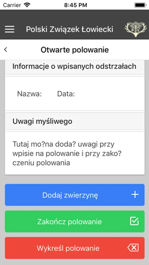 Aplikacja PZŁ EKEP™ do poprawnego funkcjonowania musi miec zapewniony dostęp do sieci internet - dane pobierane przez aplikację są danymi pobieranymi z systemu produkcyjnego PZŁ KŁ. Wszystkie informacje dotyczące polowań to dane rzeczywiste pochodzące z systemu produkcyjnego PZŁ KŁ.