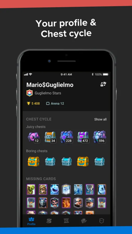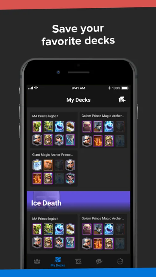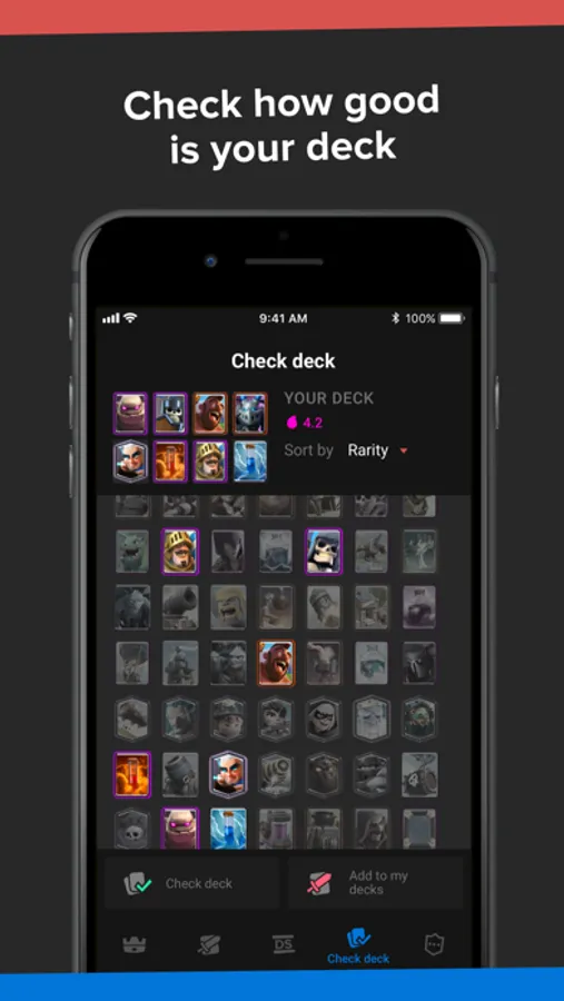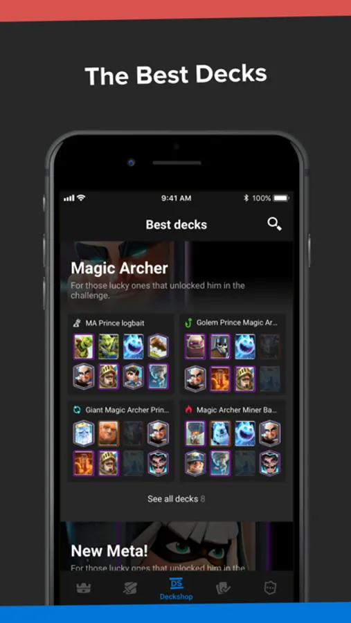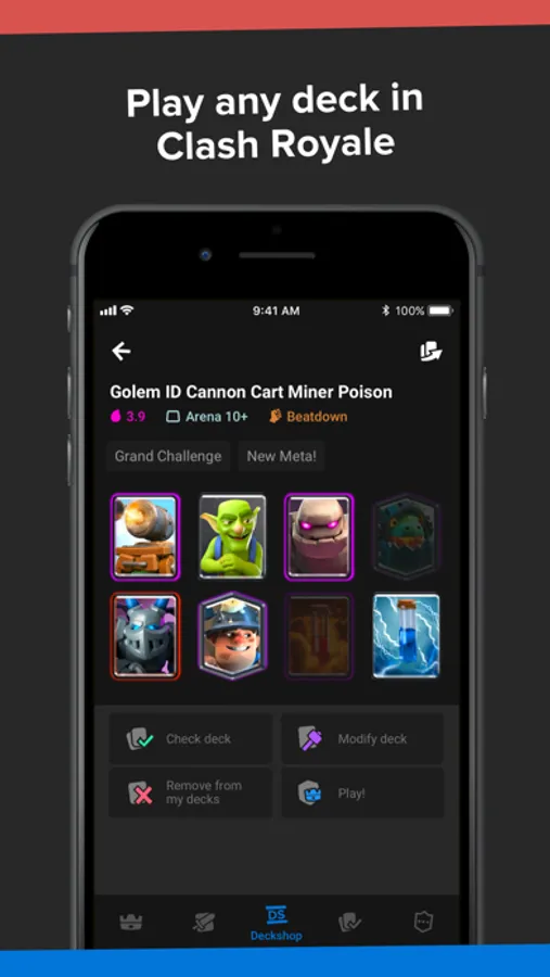 Deck Shop for Clash Royale official app! Get unlimited deck slots and fill them with the best decks in the game. Save your profile, track your chests, see your battles, create new decks and check them.