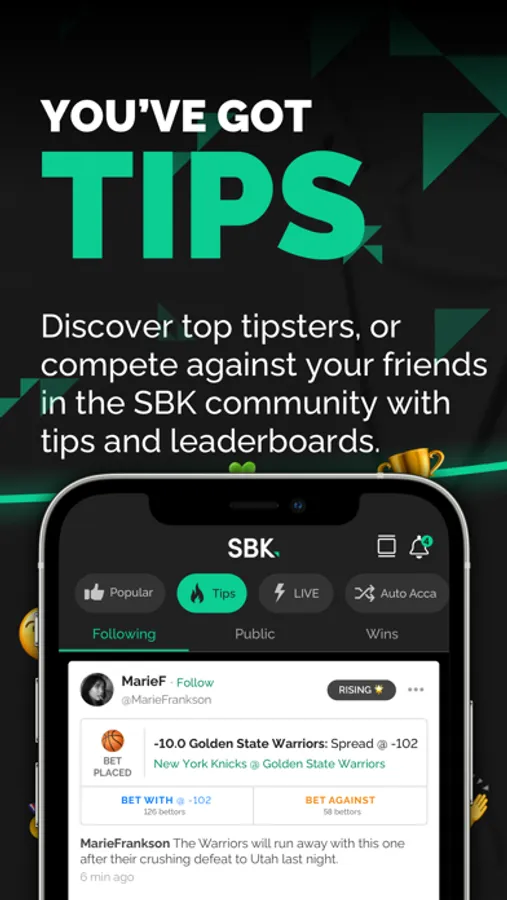 SBK also has a unique, community-led social network, where users can share their betting tips with others. You can see who is on a hot streak, compete with friends to climb the leaderboard, and share your best bets - like that slick ten-fold parlay of yours - with your followers.