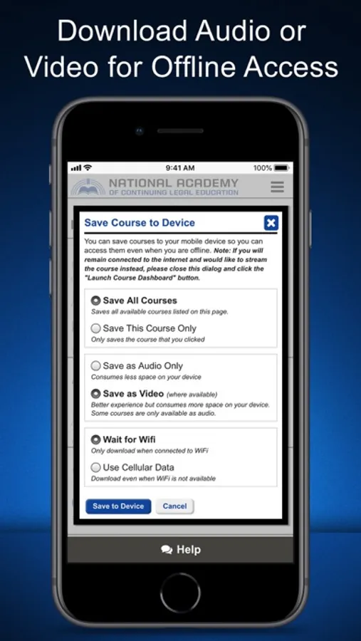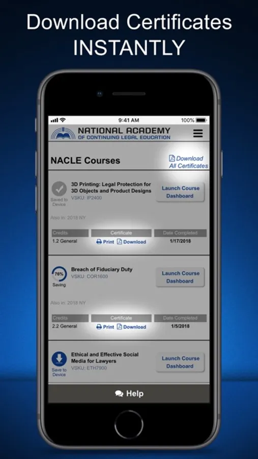 Take your CLE with you with you wherever you go! Our full-featured app lets any attorney take their MCLE courses at their own pace. Our CLE tracker knows your requirements and due dates and keeps track of your progress for you making CLE compliance a breeze even if you are licensed in multiple states. Your certificates are instantly awarded after each course and are conveniently stored in your account.