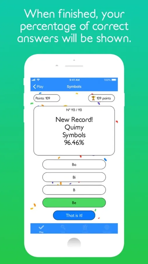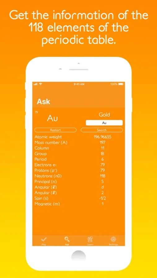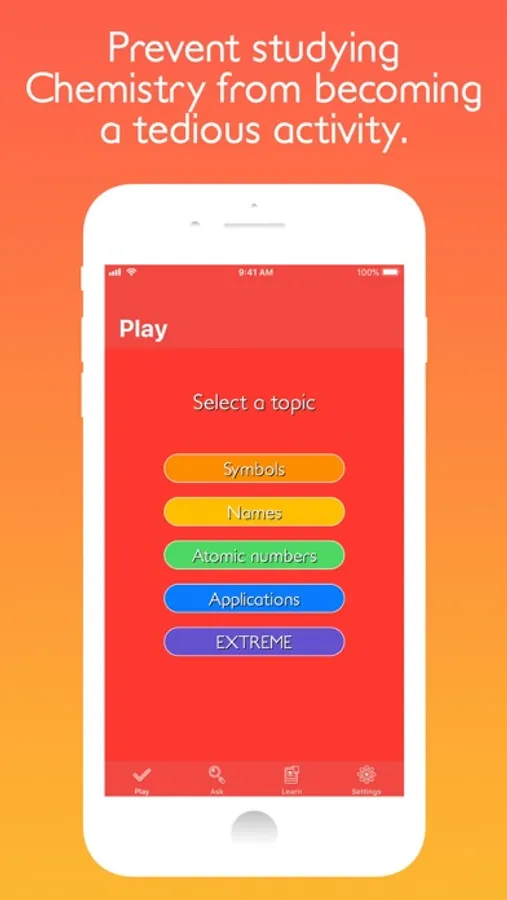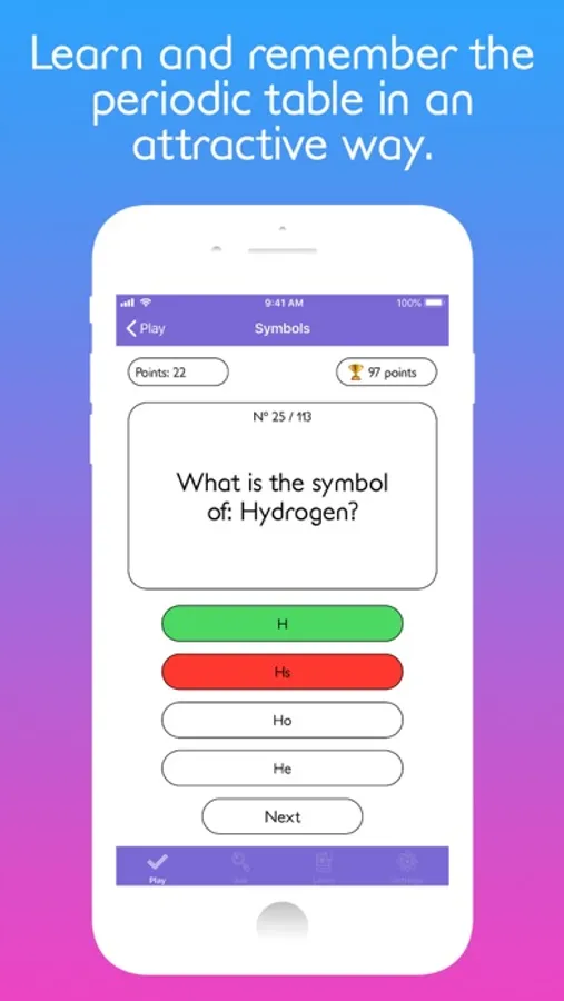 • Play and put your knowledge of the chemical elements with different topics: Symbols, Names, Atomic numbers, Applications, and EXTREME.
