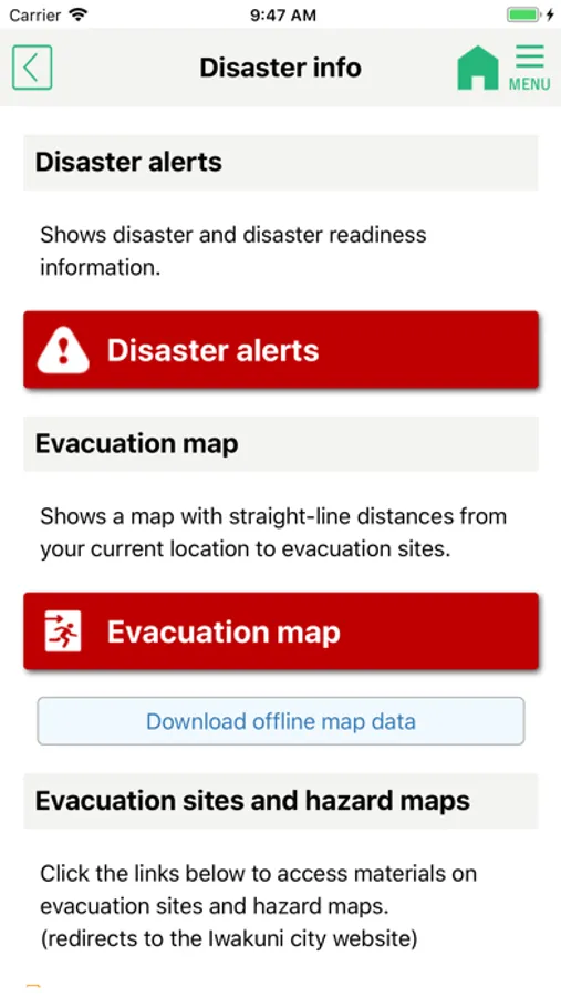 Disaster info and map of evacuation shelters in Iwakuni
