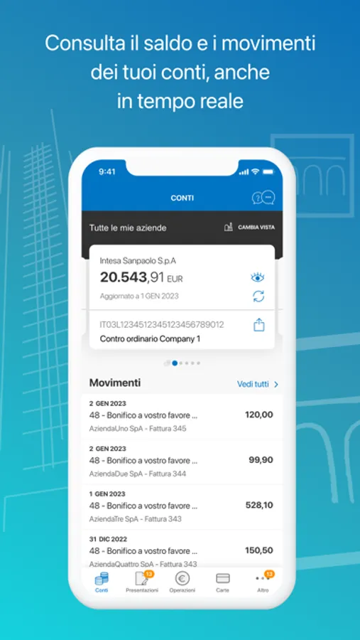 L'App permette l'autorizzazione e l'invio delle distinte in mobilità, la visualizzazione delle informative di conto corrente e gli esiti degli incassi di tutte le banche associate a Inbiz, la firma di contratti, la gestione delle carte aziendali.