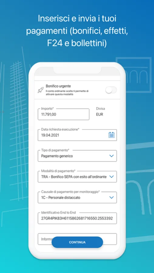 Dalla sezione “Operazioni” è possibile disporre bonifici (SCT, Istantanei ,Urgenti, Internazionali, Giroconti, Emolumenti), pagare effetti bancari, deleghe F24 e bollettini (Cbill/PagoPa, postali).
