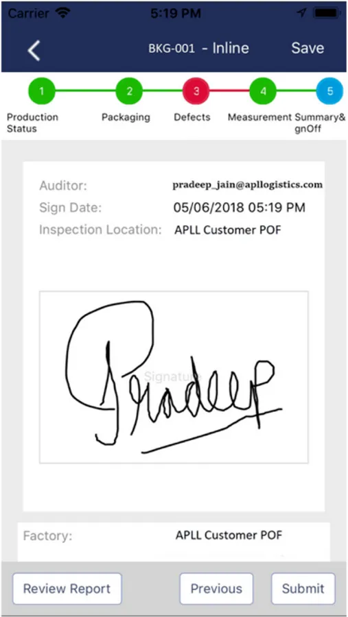 a) an App for Mobile Devices used by field quality auditors in the factories to carry out quality control using digital inline and final inspection apps developed by APLL. This enables instant communication of AQL (Acceptable Quality Level) results, defects, digital images and QC reports, which strengthens the decision-making and overall execution, and