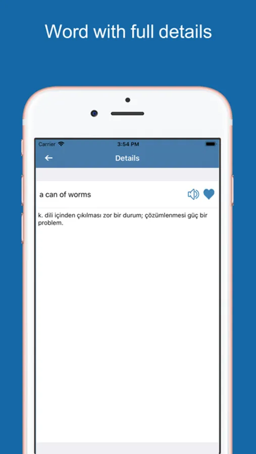 - Want to save a word meaning in the favourites? Tap the heart button and we will add this word automatically in your favourites. You can easily access to it anytime within the favourites choice in the options menu.
