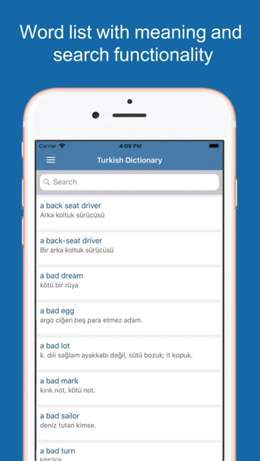 - We have a very Easy Interface to use, so everyone can use it simply without watching any tutorial. We worked hard to make everything easier to you. In the main screen, you will be able to see all words. There, you can type the english word that you are looking for and we will take care of finding the meanings of this word in Turkish language.
