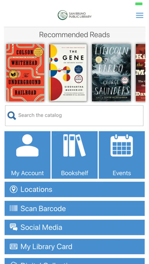 The San Bruno Library app is your connection to the library's services from your mobile device. Check your account, pay fines, renew items, search the catalog, place holds and use your digital library card (eCard).