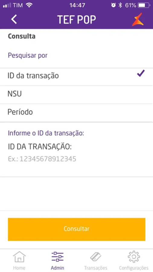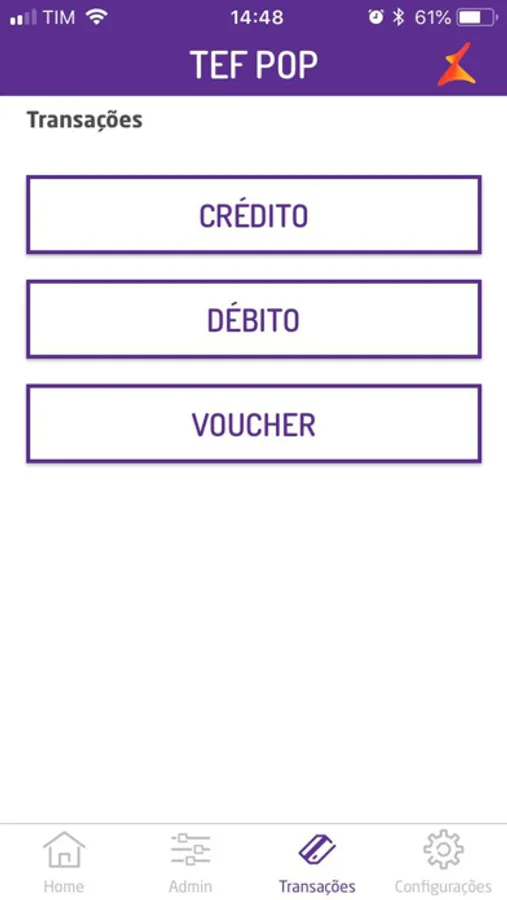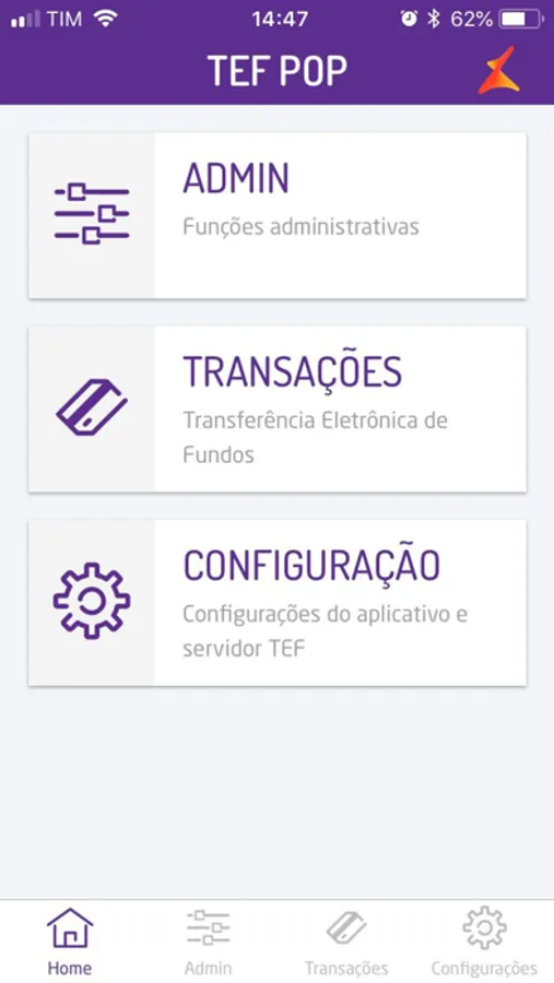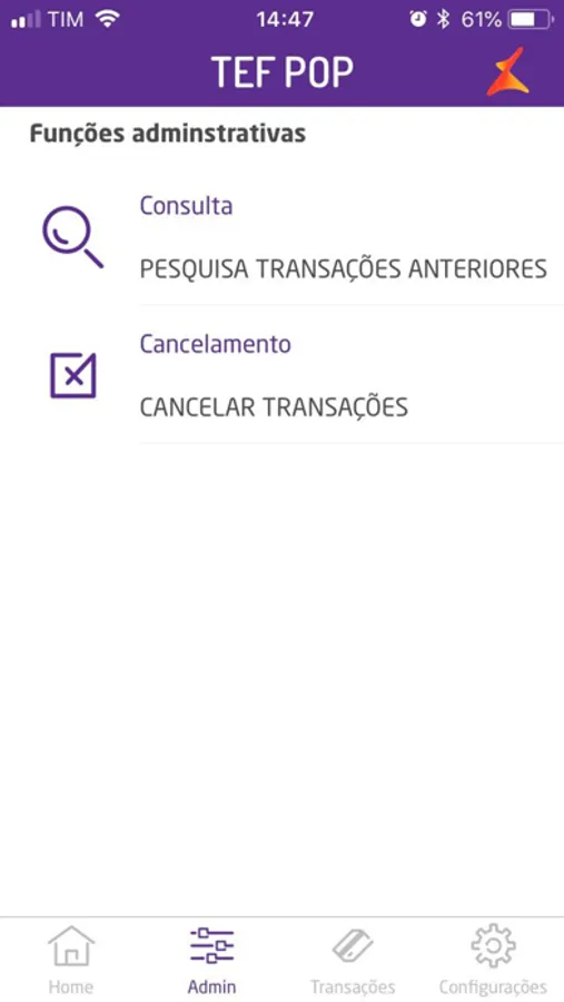 Usando o TEF Pop Mobile App, você tem acesso às funções eletrônicas de transferência de fundos, como crédito, débito e voucher, além de consultar e cancelar transações.