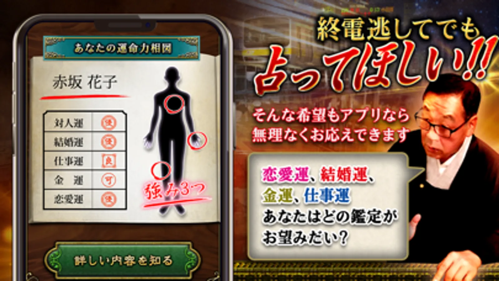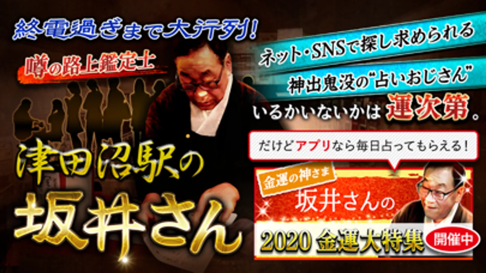本アプリでは、津田沼駅の路上鑑定士・坂井穂介の鑑定を受けることができます。
