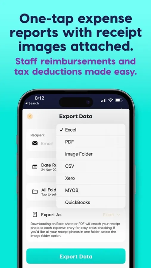 • Easy, one-tap exports of all your spending in a spreadsheet. Choose a format suited to your accounting software (Xero, MYOB, Quickbooks), with the pics of your tax receipts attached to expense items.