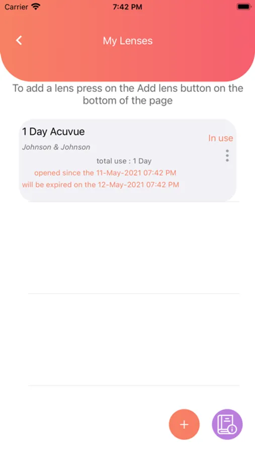 - Add and edit: you can add more than one lens and edit the information regarding the day you open it and start using it