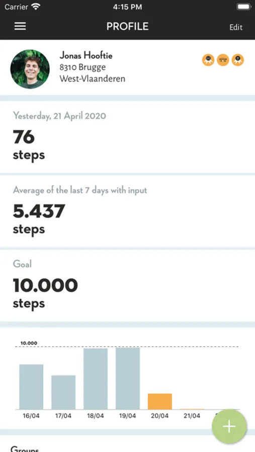 With the 10.000 stappen app, you can enter your steps, look at your profile, earn badges, track the progress of your groups, follow your friends and check the challenges and routes of your groups.