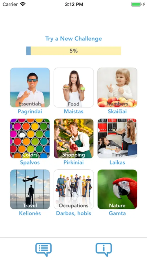 The course is made of 10 lessons (topics), each of them helping to grasp new words, expressions and grammar usable in daily live, overseas trips and classroom environments for all generations of beginner level learners. You can see all the topics on the first page of the app. The app teaches you around 315 new words and expressions.