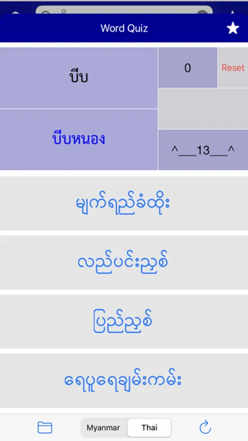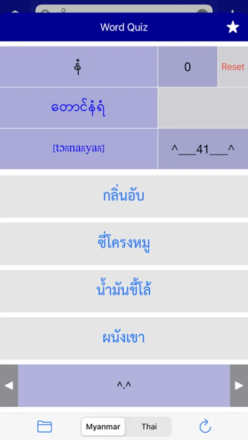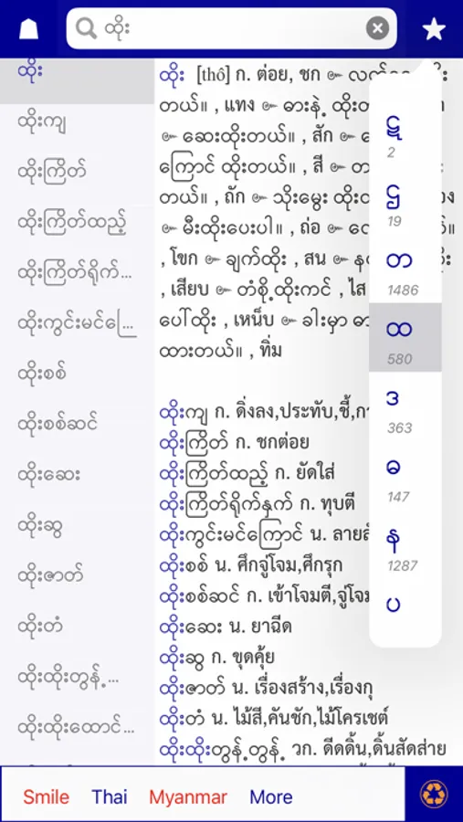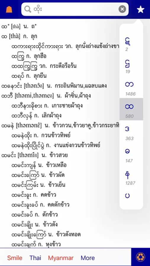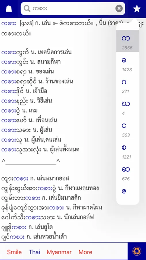 SmileThaiMyanmarPro is a Myanmar-Thai Dictionary with a quick concordance search engine for over all utterances and homographs in a built-in database. In this Pro version, there are more than 26000 Myanmar and 33000 Thai glossaries with more than 12000 useful examples and 900 borrowed words. Tools and Texts for Myanmar language learning and teaching are available.