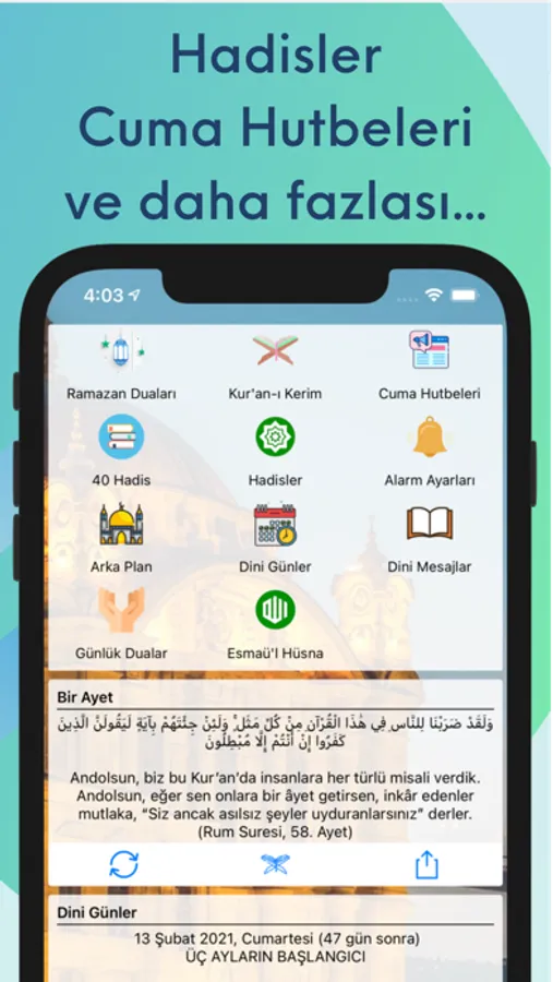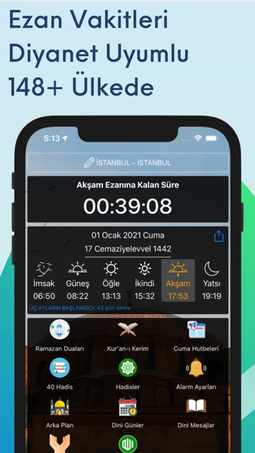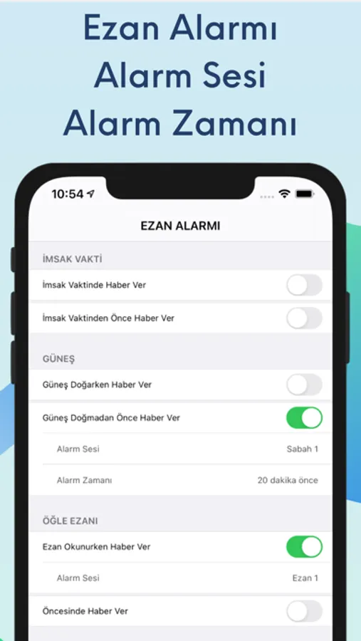 * Ezan saatinde veya öncesine alarm kurma özelliği